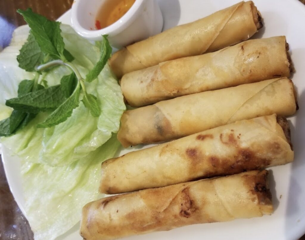 A mixture of vegetable/ chicken and/ or prawn mince, wrapped in pastry then fried to a crisp golden brown and served with lettuce, mint and our fish sauce